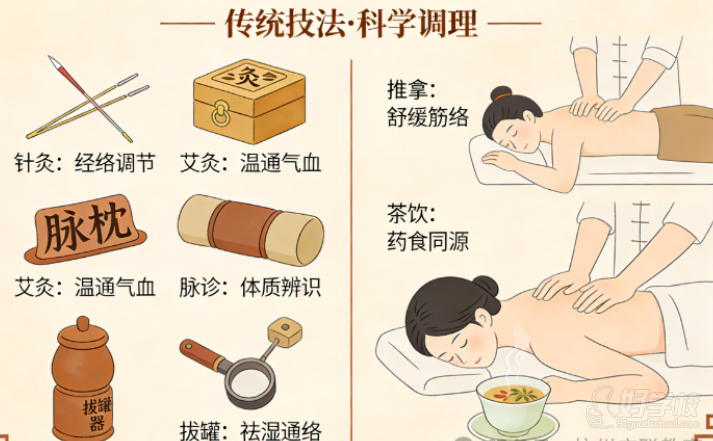 ? 課程體系:涵蓋中醫(yī)基礎(chǔ)理論(陰陽五行、藏象學(xué)說、體質(zhì)認知)+ 實用調(diào)理技術(shù)(耳穴療法、穴位敷貼、藥浴熏蒸、刮痧、拔罐、艾灸、保健按摩)+ 針對性調(diào)理方案(高血壓、糖尿病、頸肩腰腿痛、失眠、焦慮等常見問題);