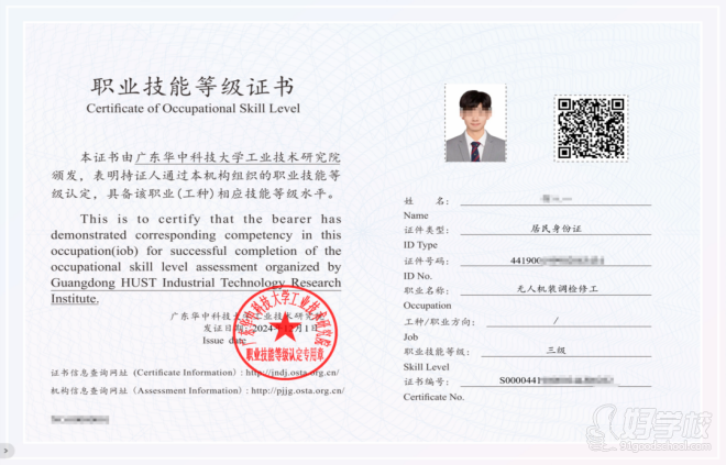 該證書由經(jīng)人力資源和社會(huì)保障部門備案的評(píng)價(jià)機(jī)構(gòu)頒發(fā),納入國(guó)家技能人才評(píng)價(jià)體系,證書信息可在國(guó)家人社部官網(wǎng)或職業(yè)技能等級(jí)證書全國(guó)聯(lián)網(wǎng)查詢系統(tǒng)查詢,具有權(quán)威性和公信力。證書表明持證人具備無人機(jī)裝調(diào)檢修領(lǐng)域的專業(yè)技能水平,涵蓋配件選型、裝配、調(diào)試、檢修與維護(hù)等核心能力,是從事相關(guān)工作的能力憑證。