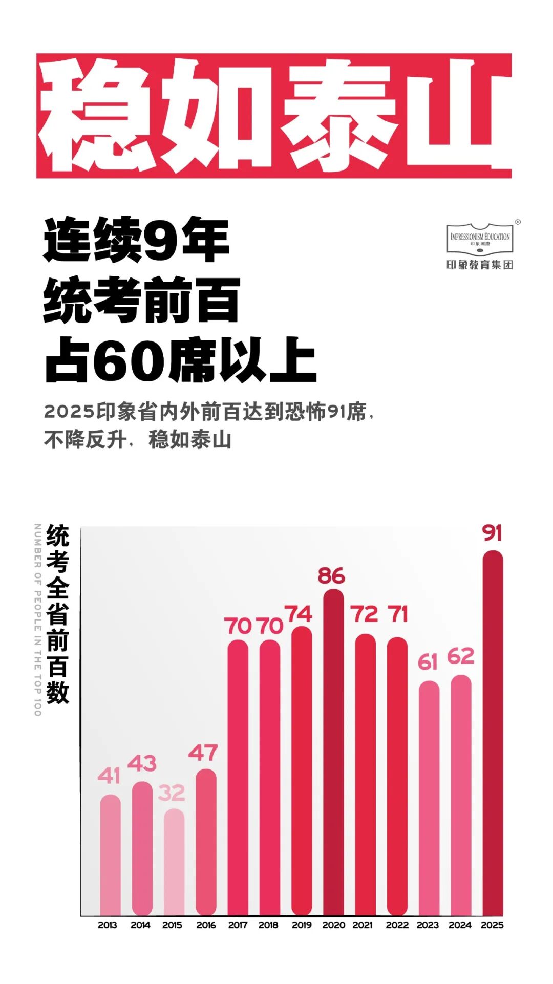 本年印象學(xué)員共拿到,一個(gè)狀元、兩個(gè)探花,一個(gè)前三名。統(tǒng)考前100占91席,前10占14席。印象連續(xù)十四年斬獲43席全省前三,從無(wú)一年中斷!