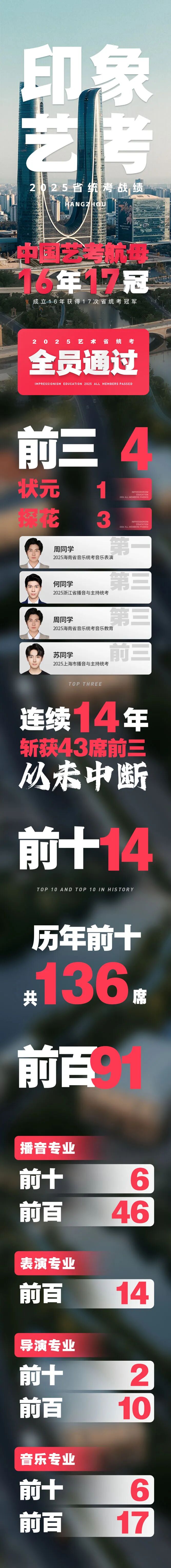 無(wú)論是突出成績(jī)的個(gè)體學(xué)員,還是學(xué)員總量在高名次的比例或是通過(guò),無(wú)論是前三甲還是前100,無(wú)論是播音專業(yè)的穩(wěn)坐霸主,還是導(dǎo)演、表演等傳統(tǒng)校考優(yōu)勢(shì)專業(yè)在統(tǒng)考層面的齊頭并進(jìn),依然昭示了印象在傳媒類統(tǒng)考占據(jù)無(wú)法撼動(dòng)的地位。偶爾取得一些好名次可能是運(yùn)氣,十六年來(lái)從未中斷,這就是“中國(guó)知名藝考教育集團(tuán)”的實(shí)力!
