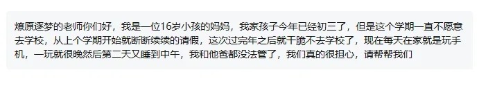 “燎原逐夢(mèng)的老師你們好,我是一位16歲小孩的媽媽,我家孩子今年已經(jīng)初三了,但是這個(gè)學(xué)期一直不愿意去學(xué)校,從上個(gè)學(xué)期開(kāi)始就斷斷續(xù)續(xù)的請(qǐng)假,這次過(guò)完年之后就干脆不去學(xué)校了,現(xiàn)在每天在家就是玩手機(jī),一玩就很晚然后第二天又睡到中午,我和他爸都沒(méi)法管了,我們真的很擔(dān)心,請(qǐng)幫幫我們?!?/p>