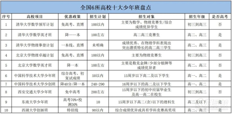 少年班招生特指部分高校面向高三、高二及低年級考生提前招生錄取的政策,通常對報(bào)考考生年齡、年級有嚴(yán)格限制?,F(xiàn)有清華大學(xué)、北京大學(xué)、中國科學(xué)技術(shù)大學(xué)、西安交通大學(xué)、東南大學(xué)、西湖大學(xué)六所高校的十個少年班招生項(xiàng)目。說明:以下內(nèi)容基于各校2024年招生信息制作,僅供大致參考,最終政策請以各校發(fā)布的官方通知為準(zhǔn)。