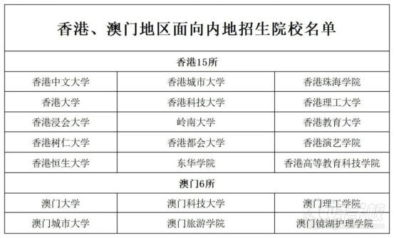 港澳高校每年招生一般于每年10月開始啟動,大多港澳地區(qū)高校在內(nèi)地均實(shí)行自主招生,不占內(nèi)地統(tǒng)招志愿名額,多數(shù)學(xué)校對考生高考成績以及英語單科成績有要求。港澳高校QS世界排名普遍較高,對于有計(jì)劃研究生出國留學(xué)的同學(xué)來說,是非常好的選擇。截至目前,港澳地區(qū)大學(xué)在內(nèi)地招生的高校,共有21所。其中,香港15所、澳門6所。